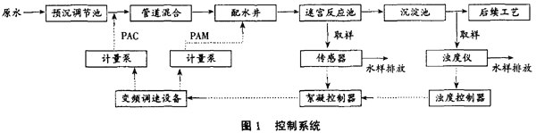 本煤礦礦井水處理廠有新、舊兩套處理系統(tǒng)。新系統(tǒng)處理工藝采用加藥絮凝、反應(yīng)、沉淀、過濾等常規(guī)工藝,舊系統(tǒng)處理工藝與新系統(tǒng)基本相同,不同之處僅在于其反應(yīng)池為折板反應(yīng)池。為了提高處理廠自動化水平、保證出水水質(zhì)、減少藥耗,需要對混凝劑和助凝劑投加進(jìn)行自動控制,該礦井水處理廠于1997年引進(jìn)了哈爾濱建筑大學(xué)研制開發(fā)的透光率脈動絮凝檢測系統(tǒng),以及由河北省唐山煤礦設(shè)計(jì)研究院開發(fā)研制的自動控制系統(tǒng),并將本系統(tǒng)應(yīng)用在新系統(tǒng)中。