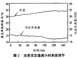 濁度控制回路的調(diào)節(jié)性能的檢測方法是人為地改變沉淀池出水濁度的設(shè)定值,觀察濁度檢測值的變化情況,系統(tǒng)通過調(diào)節(jié)使?jié)岫葯z測值基本穩(wěn)定在新設(shè)定值所需要的時間即為調(diào)節(jié)速度。圖2為當(dāng)沉淀池出水設(shè)定值由15.0NTU調(diào)整為13.0NTU時系統(tǒng)的調(diào)節(jié)情況。從圖2可以看出,在沉后水濁度目標(biāo)值下調(diào)2.0NTU后,絮凝檢測值R開始緩慢上升,這是由于濁度控制器不斷提高絮凝檢測設(shè)定值緣故,而沉后水濁度檢測值在大約40min后開始下降,大約180min后,沉后水檢測值被調(diào)整到了新的目標(biāo)設(shè)定值,這說明濁度控制回路的調(diào)節(jié)時間大約為180min。由于設(shè)定值的變化是以日計(jì),與此相比,系統(tǒng)的調(diào)節(jié)速度是比較迅速的,能滿足生產(chǎn)要求。這說明系統(tǒng)對突然性的干擾具有良好的調(diào)節(jié)能力,滿足生產(chǎn)要求。