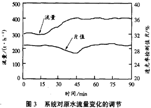 本系統(tǒng)中,由于井下工藝的要求,使得原水流量經(jīng)常發(fā)生改變,對控制系統(tǒng)造成沖擊,而原水水質(zhì)比較穩(wěn)定,變化很緩慢,對控制系統(tǒng)不會造成大的沖擊,因此只考察控制系統(tǒng)對原水流量變化的調(diào)節(jié)能力。原水流量的變化幅度一般為30%-50%,但變化速度較快,經(jīng)常在十幾分鐘內(nèi)流量發(fā)生改變,因此對控制系統(tǒng)的要求比較高。圖3為在一次流量變化時系統(tǒng)的調(diào)節(jié)情況。從圖中可以看出,系統(tǒng)對原水流量的變化的調(diào)節(jié)比較迅速及時,大約15min內(nèi)就可以將檢測值R調(diào)整到原設(shè)定值,而這對于沉淀池出水濁度的影響不大,可以滿足處理工藝的要求。