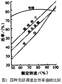 目前國(guó)外大型污水廠普遍采用轉(zhuǎn)速加臺(tái)數(shù)控制方法,定速泵按平均流量選擇,定速運(yùn)轉(zhuǎn)以滿足基本流量的要求;調(diào)速泵變速運(yùn)轉(zhuǎn)以適應(yīng)流量的變化,流量出現(xiàn)較大波動(dòng)時(shí)以增減運(yùn)轉(zhuǎn)臺(tái)數(shù)作為補(bǔ)充。但是由于泵的特性曲線高效段范圍不是很大,這就決定了對(duì)于調(diào)速泵也不可能將流量調(diào)到任意小,而仍能保持高效。四種調(diào)速方法效率-轉(zhuǎn)速關(guān)系如圖1。