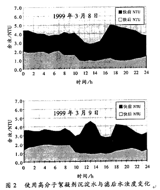 圖2是沉淀池與濾池的濁度去除率。從濁度曲線看出,當(dāng)添加聚二烯丙基二甲基氯化銨與陰離子高分子絮凝劑時,沉淀池出水的濁度僅有略微改善,但濾池的截污率確明顯提高,這與實驗室結(jié)果相一致。