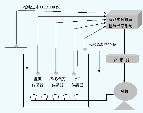 本系統(tǒng)由進水COD/BOD、曝氣池溫度、污泥濃度、溶解氧和出水COD/BOD傳感器,智能實時供氧控制專家系統(tǒng),變頻器,風(fēng)機等構(gòu)成。在線傳感器把獲取的數(shù)據(jù)傳輸?shù)街悄軐崟r供氧控制系統(tǒng)以后,由控制系統(tǒng)和變頻器調(diào)節(jié)風(fēng)機的轉(zhuǎn)速。