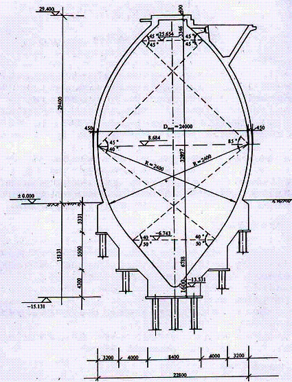 該消化池池體分為上部薄殼和下部厚殼兩部分。地面以上為薄殼部分,高度為29m,最大內(nèi)徑為24m,殼體壁厚為變厚度,最大處為700mm,最小處400mm,地面以下深15m,基礎采用直徑為800mm鉆孔灌注樁,池壁水平向及垂直向均采用低松馳高強度鋼絞線施加預應力。水平向采用HM型游動錨張拉錨固體系,豎向采用OVM型張拉錨固體系。該工程1993年11月份完成了閉水試驗和池體應力測試。圖1-1為池體的豎向剖面圖。