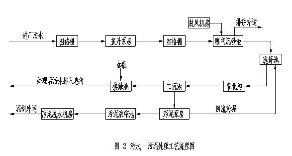 污水處理工藝采用DE型氧化溝系統(tǒng),污泥在氧化溝內(nèi)已趨于穩(wěn)定,無需另設(shè)消化池,剩余污泥經(jīng)濃縮后直接機(jī)械脫水。因此,運(yùn)行更為方便,并可節(jié)省電耗和基建投資。工藝流程詳見圖2。