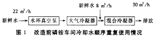 改造前磷銨車間磷銨熱風(fēng)機及料漿循環(huán)泵冷卻水(約10m3/h)直排;水環(huán)真空泵、大氣冷凝器和混合冷凝器的冷卻水順序重復(fù)使用,使用情況見圖1。