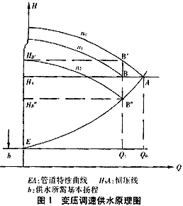 由圖1可見,當流量從Q0減為Q1時,如采用恒速泵則揚程升至HB′,此時B′B″段的揚程是多余的;如采用恒壓變頻調速泵則其轉速將由原來的n0下降為n1以維持恒壓HA(對應的揚程為B點),此時BB″段的揚程是多余的,但B′B″>BB″,顯見恒壓調速比恒速供水節(jié)能。