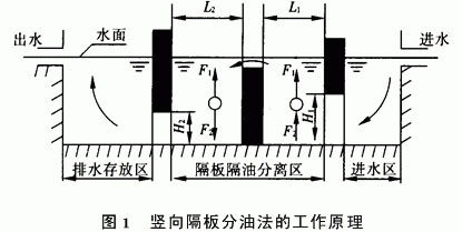 豎向隔板分油法是在平流式自然分油法的基礎上發(fā)展起來的一種方法,它將水流改為上下流動,這樣既增加了廢水流程,又減少了分油池的占地面積,降低了造價,同時還可提高除油效率。其原理見圖1。