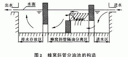 蜂窩斜管分油法是將除油池在同一過水斷面上分成若干小格,這樣便減少了除油池的水力半徑,降低了水流雷諾數(shù),提高了水流弗勞德數(shù),因而可提高油水的分離效率。格子越小則其分離效果越好,但格子太小易產(chǎn)生阻管現(xiàn)象,所以常用邊長為30、50、80mm的正六邊形等規(guī)格斜管。蜂窩斜管分油池的構造見圖2。