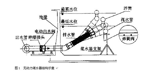 無(wú)動(dòng)力潷水器是整個(gè)工藝中最具特色的設(shè)備之一,它的設(shè)計(jì)尺寸由排水量、排水管徑、池的大小、最高水位與最低水位的高差等水力條件決定。無(wú)動(dòng)力潷水器在設(shè)計(jì)和運(yùn)行中具有較多優(yōu)點(diǎn):