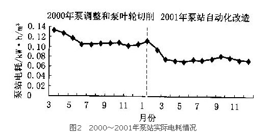 圖2為該廠泵站2000~2001年的實(shí)際電耗情況。由圖2可見(jiàn),自2000年3月起到6月,通過(guò)對(duì)泵的合理調(diào)配和泵的葉輪改造,泵站的平均輸水電耗從改造前的0.132 kW·h/m3 下降到 0.105 kW·h/m3左右;從2001年1月起到4月,自動(dòng)化改造完成后,輸水電耗又進(jìn)一步下降到0.075 kW·h/m3左右 。