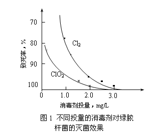 我們研究了ClO2對水中細(xì)菌的殺滅效果,結(jié)果表明:ClO2對水中金黃色葡萄球菌、綠膿桿菌、枯草芽孢桿菌、藤黃八迭球菌、痢疾桿菌、沙門氏菌和志賀氏菌等多種致病菌具有優(yōu)良的殺滅效果(如ClO2對綠膿桿菌的滅菌效果見圖1),并明顯好于Cl2。
