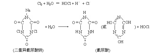 含氯制劑,包括氯(液氯(Cl2)、NaClO和Ca(OCl)2•3H2O等)、二氯異氰尿酸鈉和三氰異氰尿酸及二氧化氯ClO2。前3種含氯制劑分別稱為第一、第二和第三代消毒劑,而ClO2稱為第四代消毒劑。前3種含氯制劑溶于水后均產(chǎn)生HOCl,例如: