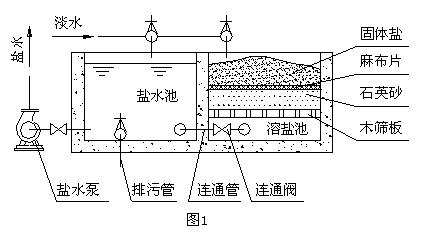 接下來探討溶液(鹽水)的濃化。溶液的濃化相對簡單,可以這樣做:先打開連通閥(參見圖1),然后舀鹽水池里的稀鹽水澆在溶鹽池里的固體鹽上,邊澆邊測鹽水的濃度,直到符合要求為止。