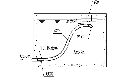 為了消除鹽水池靜壓強(qiáng)對鹽水泵出口壓頭的影響,筆者設(shè)計了一套保持鹽水泵入口壓強(qiáng)恒定裝置如圖2:制作一個浮漂,用尼龍繩將一根軟管的一端吊掛在浮漂的下方,軟管的另一端固結(jié)在鹽水池出口處(注意軟管與鹽水池出口的接口處不能泄露,軟管最好選用內(nèi)置鋼絲螺旋支架的塑料管以防抽癟。安裝軟管時,注意不要因為安裝了軟管及其管件而使鹽水泵入口管徑變得太小和造成太大的管路阻力,注意不要有浮漂的零部件被鹽水泵吸入)。由于軟管的上端(鹽水泵入口)在浮漂的作用下能保持與鹽水液面的距離不變,從而消除了鹽水池靜壓強(qiáng)對交換器內(nèi)鹽水線速度的影響。