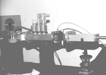如圖3是所示,微波等離子體炬(MPT)是一種開(kāi)放結(jié)構(gòu)的等離子體源,是由金欽漢等于1985年首先提出來(lái),目前實(shí)驗(yàn)室常用的微波源是2.45GHz,MPT炬管是一個(gè)直接耦合的同軸波導(dǎo)微波諧振腔,腔內(nèi)存在著固定的電場(chǎng)和磁場(chǎng)分布,而這種特定的能量分布維持了等離子體放電,將一段同軸線(xiàn)一端短路,另一端開(kāi)路,就構(gòu)成了同軸諧振腔。MPT炬管的內(nèi)管和中管是相連通的終端短路活塞的存在使其成為一個(gè)同軸微波諧振腔,同軸諧振腔有三種耦合方式:直接耦合,電容耦合和電感耦合。直接耦合又稱(chēng)為電導(dǎo)耦合,其方法是在同軸腔外導(dǎo)體上開(kāi)孔,將同軸傳輸線(xiàn)(天線(xiàn))的內(nèi)導(dǎo)體直接連接導(dǎo)同軸腔的內(nèi)導(dǎo)體上,MPT炬管就是采用的這種方式。當(dāng)炬管頂端到調(diào)諧活塞端面的距離是λ/4的奇數(shù)倍時(shí)(一般為3λ/4),頂端的電場(chǎng)為最強(qiáng),就可在頂端形成和維持等離子體。圖4是電子科技大學(xué)高能所的微波等離子體火炬系統(tǒng),微波的工作頻率為2.45GHz,磁控管產(chǎn)生的微波通過(guò)波導(dǎo)系統(tǒng)、三端調(diào)配和短路活塞耦合到同軸傳輸線(xiàn)(天線(xiàn)),并在離內(nèi)管端口幾厘米的地方形成特定的電磁場(chǎng)分布,從而使空氣等工作氣體電離形成等離子體火炬,圖中的等離子體火炬的火焰長(zhǎng)度只要幾厘米,它的主要應(yīng)用是金剛石薄膜、材料的表面改性、化學(xué)分析、納米材料制備、廢物處理等。