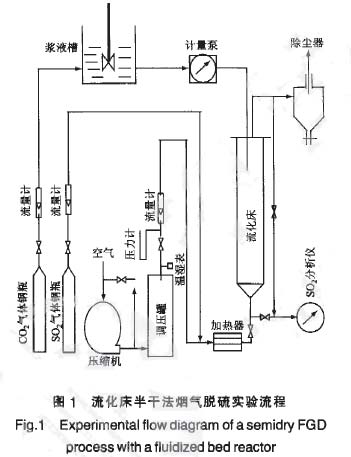 實驗裝置如圖l所示。由空氣壓縮機鼓入的空氣與來自鋼瓶的SO2氣體混合形成模擬煙氣, 預熱到一定溫度后從底部進人流化床反應器,空氣及SO2的流暈分別由轉(zhuǎn)子流量計測量。流化床反應器高1.1 m、內(nèi)徑12.5 cm.床內(nèi)裝有粗砂作為惰性流化介質(zhì),上升的煙氣使其流化。脫硫劑料漿由脫硫劑與水按預定的濃度配制,經(jīng)CO2氣體活化一定時間后.從床頂部連續(xù)滴入反應器。滴入反應器內(nèi)的脫硫劑漿液,遇流化介質(zhì)后分散包裹在其表面,漿液中的脫硫劑與煙氣中的SO2發(fā)生化學反應,從而脫除煙氣中SO2。脫硫同時,脫硫劑料漿中的水分接受煙氣和流化介質(zhì)的熱量而蒸發(fā)。當未反應的脫硫劑及脫硫產(chǎn)物被干燥到一定程度時,將脫離流化介質(zhì)表面,被脫硫后的煙氣帶出床外,由旋風分離器收集。除塵后的煙氣排出體系,而流化介質(zhì)因有較大的終端速度.仍保留在床內(nèi)并處于流化狀態(tài)。