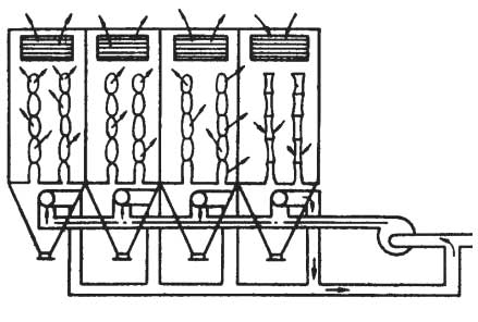 圖1是反吸風(fēng)清灰大型袋式除塵器的示意圖。它有三個室在工作,一個室在清灰。通過主風(fēng)機吸入端的負壓作用,對濾袋進行反吸清灰。這種除塵器的特點是處理風(fēng)量大,可達105m3/h以上。常分成3~20個室,采用分室清灰。