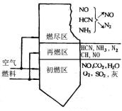 再燃燒法就是使燃料分級燃燒,如圖2所示。各自都分兩級送入的燃料與空氣將燃燒分成三個區(qū)域:初燃區(qū)送入(80~85)%的一次燃料,在a>1的氧化性氣氛下進行燃燒,生成NO,CO2,H2O,SO2,O2和灰分等;再燃區(qū)送入其余(15~20)%的二次燃料,在a<1的還原性氣氛下燃燒,產(chǎn)生的碳氫基團CH與部分NO反應(yīng)形成HCN、NH3等中間產(chǎn)物,中間產(chǎn)物再與NO反應(yīng)生成N2;燃盡區(qū)將二級空氣送入,完成全部燃燒,同時把殘余的中間產(chǎn)物部分還原成N2,部分氧化成NO。一般情況下,采用再燃燒法可使NO的排放濃度降低50%以上。