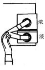 實現(xiàn)煤粉濃淡燃燒方式的關(guān)鍵是,如何將一次風(fēng)煤氣流中的煤粉分離成濃淡兩股風(fēng)煤氣流。四角切圓直流燃燒器多采用離心分離原理,分叉彎管是一種簡單的分離器,如圖4所示的垂直分離。煤粉氣流由于離心作用向上支管濃集,于是兩個噴口分別形成過濃和過淡火焰,在噴口上方還有二次風(fēng)。當(dāng)然也可通過分離作用,在爐膛水平方向形成中心富燃料和外圍貧燃料的分區(qū)燃燒。還有其他的煤粉濃縮方法,如旋風(fēng)分離濃縮,百葉窗錐形軸向濃縮及管內(nèi)加裝偏流導(dǎo)向器濃縮等。