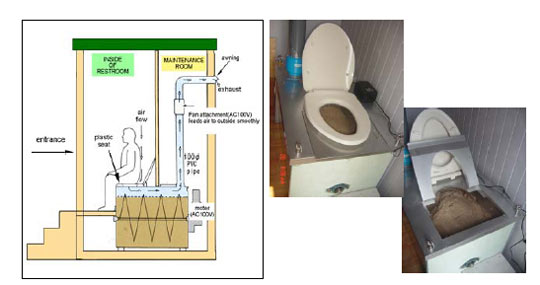 工作原理:在便座下的不銹鋼盒子中裝入適量的鋸木屑為反應(yīng)介質(zhì),通過適當(dāng)攪拌使得排入的糞便與鋸木屑混合并在好氧條件下發(fā)生分解。同時用電熱條控制其中的溫度均衡并高于大氣溫度,使得小便中的水分以及糞便分解過程中產(chǎn)生的水和二氧化碳通過排氣扇排入大氣。糞便中的N、P等營養(yǎng)鹽留在鋸木屑中,經(jīng)過一段時間后將其取出就是干燥、清潔的優(yōu)質(zhì)有機(jī)肥料,可施用于農(nóng)田,進(jìn)行有機(jī)廢棄物的資源化循環(huán)利用。這一新型生態(tài)廁所的關(guān)鍵技術(shù)在于必須維持反應(yīng)器中氧、水分和溫度三者的平衡,使得排入其中的糞便和廚房有機(jī)垃圾發(fā)生好氧分解。小便中95%為水分,小便中的水分蒸發(fā)后,糞便的體積大大減少。鋸木屑的高孔隙率使得糞便在好氧條件下發(fā)生分解,其分解速度快,分解過程中不發(fā)生臭味。最終的產(chǎn)物從某種意義上講是被濃縮的、性狀安定的、易于使用的有機(jī)肥料。[6]