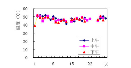 日本北海道大學(xué)環(huán)境工程系的Sonoko Nakta等以大腸桿菌存活量為指標(biāo)對抑制病原菌生長的因素進(jìn)行了實(shí)驗,發(fā)現(xiàn)溫度與病原菌濃度存在一定關(guān)系,45℃以上的高溫能明顯抑制或消滅病原菌。[7]經(jīng)實(shí)際測驗,如圖所示,反應(yīng)器溫度的平均值保持在39.1-51.8℃之間,45℃以上占所有測量點(diǎn)溫度平均值的78.5%,這對病原菌的抑制非常有利。