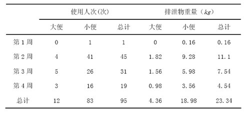 每天記錄使用人次與有機(jī)廢物投入量,并進(jìn)行統(tǒng)計分析,結(jié)果如表1所示。大便和小便的頻次比為12:83 =1: 6.9。小便投入量較多。