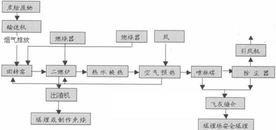 ![]() 圖1 回轉(zhuǎn)組合窯危險廢物焚燒工藝流程簡圖 |