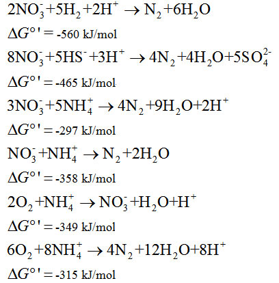 NH4+還可以被異養(yǎng)反硝化細(xì)菌作為最終電子受體,通過生物異化還原;通過自養(yǎng)反硝化細(xì)菌如反硝化硫桿菌的作用,利用含硫化合物和無機(jī)碳化合物作為能源進(jìn)行反硝化被還原[20]。