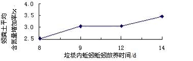 蚯蚓分解垃圾過(guò)程形成的蚓糞土團(tuán);ハ喽询B,有許多毛細(xì)空隙,促進(jìn)游離氣體和水分、肥料深入土壤,滋長(zhǎng)微生物,中和土壤pH,改善了土壤結(jié)構(gòu)和理化性狀[9],促使貧土變沃土。以蚓糞土含氮量增加率為基準(zhǔn),考察土壤中肥力之變化。用凱氏定氮儀測(cè)定經(jīng)環(huán)毛蚯蚓處理垃圾1周蚓糞土含氮量[10],結(jié)果見(jiàn)圖5。