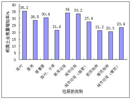 由圖5可見(jiàn),蚯蚓在改善土壤含氮量方面有顯著的效果,以菜葉為主要餌料所得的蚓糞土肥效最高,其含氮量增加率達(dá)35.2%,其他生活垃圾所得的蚓糞土含氮量亦有20%以上的增幅。