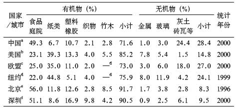 來源與說明:a.2000年全國67個城市的統(tǒng)計平均值;b.USEPA530-R-03-011 Municipal Solid Waste in the United States:2001 Facts and Figures; c.http://europa.eu.int/comm/environment/waste/index.htm;d.統(tǒng)計在庭院垃圾中;e.《促進中國城市垃圾填埋氣體收集利用國家行動方案附錄文件》;f.深圳市環(huán)境衛(wèi)生設(shè)施總體規(guī)劃。