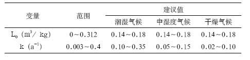 應用Scholl Canyon模型的關(guān)鍵是參數(shù)L0和k值的確定。參數(shù)k值與很多因素有關(guān),如含水率、可利用的營養(yǎng)物質(zhì)、pH和溫度等;而L0則與垃圾成分有關(guān)。表 2 為美國國家環(huán)保局建議的取值范圍。