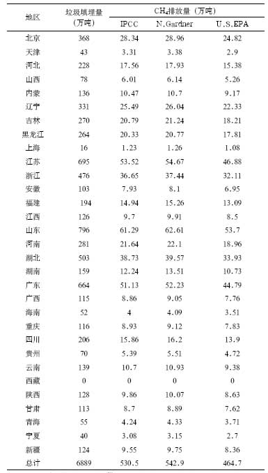 由表 3 可知,三種計算方法計算出的CH4潛勢基本相當,證明2004年全國經(jīng)衛(wèi)生填埋的垃圾能產(chǎn)甲烷的總量約為520萬噸,如果能夠利用起來,相當于700萬噸左右煤炭的能源潛力,同時對環(huán)境保護所起的作用將更為可觀。