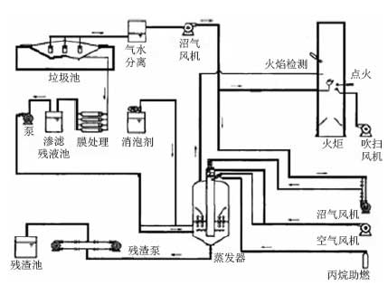 北京安定垃圾填埋場的填埋氣體利用項目是我國第一個CDM(清潔發(fā)展機制)項目。該項目利用甲烷燃燒時釋放出的熱能來蒸發(fā)滲濾液處理后的濃縮液。該裝置主要由火炬系統(tǒng)(氣水分離罐、鼓風機、火炬點燃、安全檢測及尾氣排放煙筒等設(shè)備)和蒸發(fā)罐系統(tǒng)(沼氣加壓風機、空氣鼓風機、蒸發(fā)罐點燃、滲濾液濃縮液輸入管道、排渣管道、尾氣二次燃燒等設(shè)備)兩組設(shè)備組成。工藝流程見圖 2 。