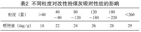 用磨碎機將粉煤灰磨碎并用分樣篩將粉煤灰篩分成6種不同粒徑的顆粒。利用不同粒度的改性粉煤灰對制革廢水中的雜質(zhì)進行吸附試驗,單位重量改性粉煤灰對雜質(zhì)的吸附值測試結(jié)果見表2。