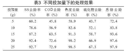 取不同量的180目以下的改性粉煤灰置于1L燒杯中,分別加入500mL廢水,攪拌30min后靜置20min,取上清液測定出水水質(zhì),結(jié)果見表3。