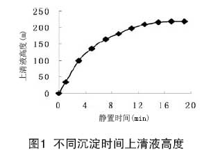 取適量改性粉煤灰置于1L燒杯中,加入500mL廢水,攪拌30min后將廢水倒入500mL量筒中觀察不同沉降時間的上清液高度,試驗結(jié)果見圖1。由試驗結(jié)果看,改性粉煤灰處理制革廢水沉降過程較快,12~16min基本完成沉降過程,且完全沉降后污泥體積較小。