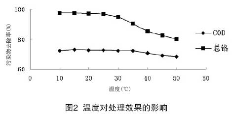 (2)溫度對處理效果有一定的影響。在10℃~50℃的范圍內(nèi),溫度對COD的去除率基本沒有影響,而對總鉻的去除率卻有很大影響。溫度由30℃升高至50℃時,總鉻的去除率由95.3%下降到80.2%。