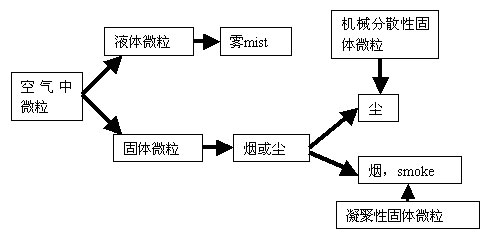 (4)煙塵(fume):分散性和凝聚性固體微粒。(5)霧(mist):包括所有液態(tài)分散性微粒的液態(tài)凝集性微粒,如很小的水滴、油霧,漆霧和硫酸霧等,粒徑在0.1~10μm之間。