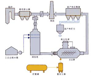 PPCP主要由煙氣調(diào)質(zhì)系統(tǒng),脈沖高壓電源系統(tǒng),反應(yīng)器系統(tǒng),副產(chǎn)物收集系統(tǒng)、控制系統(tǒng)、氨站和輔助裝置構(gòu)成。除塵后的鍋爐煙氣,經(jīng)煙氣調(diào)質(zhì)塔調(diào)節(jié)煙氣的溫度和濕度,然后流經(jīng)反應(yīng)器,在反應(yīng)器中的脈沖電暈放電等離子體場中,煙氣中的二氧化硫和氮氧化物與氨站提供的氨氣發(fā)生作用,分別形成硫酸銨和硝酸銨。通過副產(chǎn)物收集器下來用作化肥,潔凈的煙氣從煙囪排出,工藝流程見下圖: