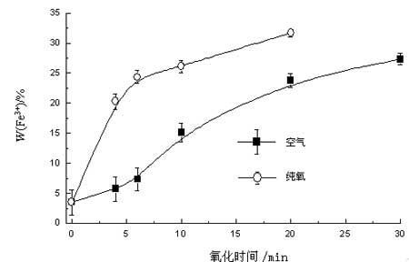 ![]() 圖3 渣中Fe 3+的質(zhì)量百分含量與氧化時間的關(guān)系(緩冷測量值) |