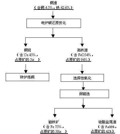 銅渣主要由鐵硅酸鹽和磁鐵礦組成,鐵在40%以上,由于渣相組成十分復(fù)雜,晶粒細小,且鐵組分主要以鐵硅酸鹽形式存在而難于利用和處理。為此采用”先銅后鐵”的處理順序。