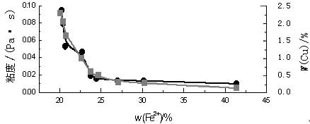 ![]() 圖2 渣中殘余銅的質(zhì)量分?jǐn)?shù),粘度與Fe2+的質(zhì)量分?jǐn)?shù)關(guān)系 |
