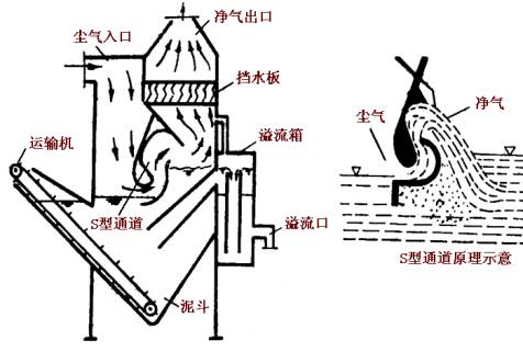 圖5-5-2是沖激式除塵器的示意圖,含塵氣體進(jìn)入除塵器后轉(zhuǎn)彎向下,沖激在液面上,部分粗大的塵粒直接沉降在泥漿斗內(nèi)。隨后含塵氣體高速通過S型通道,激起大量水滴,使粉塵與水滴充分接觸。在正常情況下,除塵器阻力為1500Pa左右,對(duì)5μm的粉塵,效率為93%。沖激式除塵器下部裝有刮板運(yùn)輸機(jī)自動(dòng)刮泥,也可以人工定期排放。
