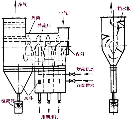 ①貯水式:內(nèi)裝一定量的水,高速含塵氣體沖擊形成水滴、水膜和氣泡,對(duì)含塵氣體進(jìn)行洗滌,如沖激式除塵器、水浴式除塵器、臥式旋風(fēng)水膜除塵器。
