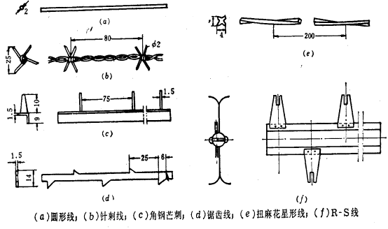 芒刺型電暈線是依靠芒刺的尖端進(jìn)行放電。形成芒刺的方式很多,R—S是目前采用較多的一種(見圖5-7-9),它是以直徑為20mm的圓管作支撐,兩側(cè)伸出交叉的芒刺。這種線的機(jī)械強(qiáng)度高,放電強(qiáng)。芒刺式采用點放電代替極線全長的放電,試驗表明,在同樣的工作電壓下,芒刺式的電暈電流要比星形線大,有利于捕集高濃度的微小塵粒。芒刺式電暈極的刺尖會產(chǎn)生強(qiáng)烈的離子流,增大了電除塵器的電風(fēng)(由于離子流對氣體分子的作用,氣體向集塵極的運動稱為電風(fēng)),有利于減少電暈閉塞。