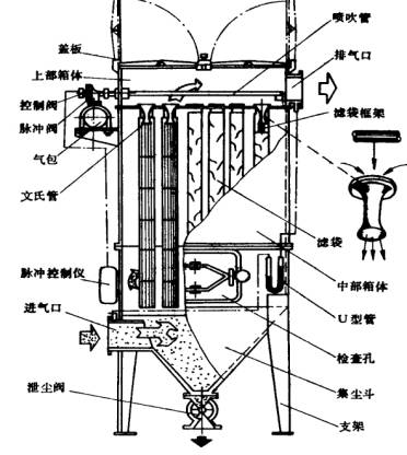 含塵空氣通過濾袋時,粉塵阻留在濾袋外表面,凈化后的氣體經(jīng)文丘里管從上部排出。每排濾袋上方設(shè)一根噴吹管,噴吹管上設(shè)有與每個濾袋相對應(yīng)的噴嘴,噴吹管前端裝設(shè)脈沖閥,通過程序控制機構(gòu)控制脈沖閥的啟閉。脈沖閥開啟時,壓縮空氣從噴嘴高速噴出。帶著比自身體積大5~7倍的誘導(dǎo)空氣一起經(jīng)文丘里管進入濾袋。濾袋急劇膨脹引起沖擊振動,使附在濾袋外的粉塵脫落。