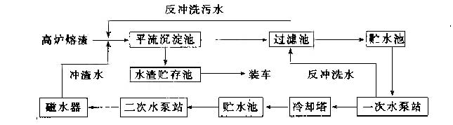 ③水力輸送式 熔渣在爐前水淬槽水淬成粒,經(jīng)渣溝水力輸送到沉淀池。供水方式可采用循環(huán)式或直流式兩種。我國(guó)255m3以上的高爐多采用此法。