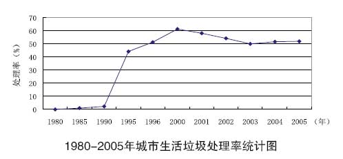 我國城市生活垃圾處理起步于20世紀(jì)80年代后期,隨后城市垃圾處理水平不斷提高。2004年全國年清運(yùn)城市垃圾1.55億噸,共有垃圾處理廠(場)559座,垃圾處理能力達(dá)23.9萬噸/日,垃圾處理率為51.5%。2005年垃圾處理能力達(dá)到25.7萬噸/日,集中處理量為8108萬噸,集中處理率為51.97%(見下表及圖)。在1980-2005年期間,城市垃圾清運(yùn)量年平均增長率為6.8%,城市生活垃圾量的增長與城市人口增長基本同步。