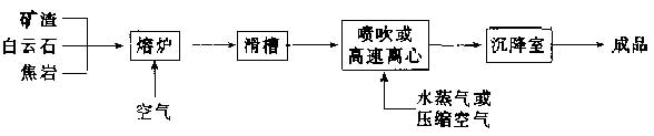 礦渣棉是以高爐渣為主要原料,加入白云石、玄武巖等調(diào)整成分及燃料,加熱熔化后采用高速離心法或噴吹法制成,是一種棉絲狀礦物纖維。其具有質(zhì)輕、保溫、隔聲、隔熱防震等性能,可以加工成各種板、氈、管殼等制品。礦渣棉生產(chǎn)工藝如圖所示。